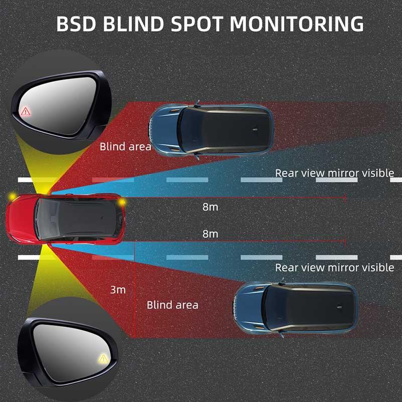 El sistema de detección de puntos ciegos (BSD) detecta el área ciega del espejo retrovisor a través del radar en la parte trasera del vehículo. Puede detectar el punto ciego del vehículo y ayudar al conductor a evitar el riesgo de cambio de carril.