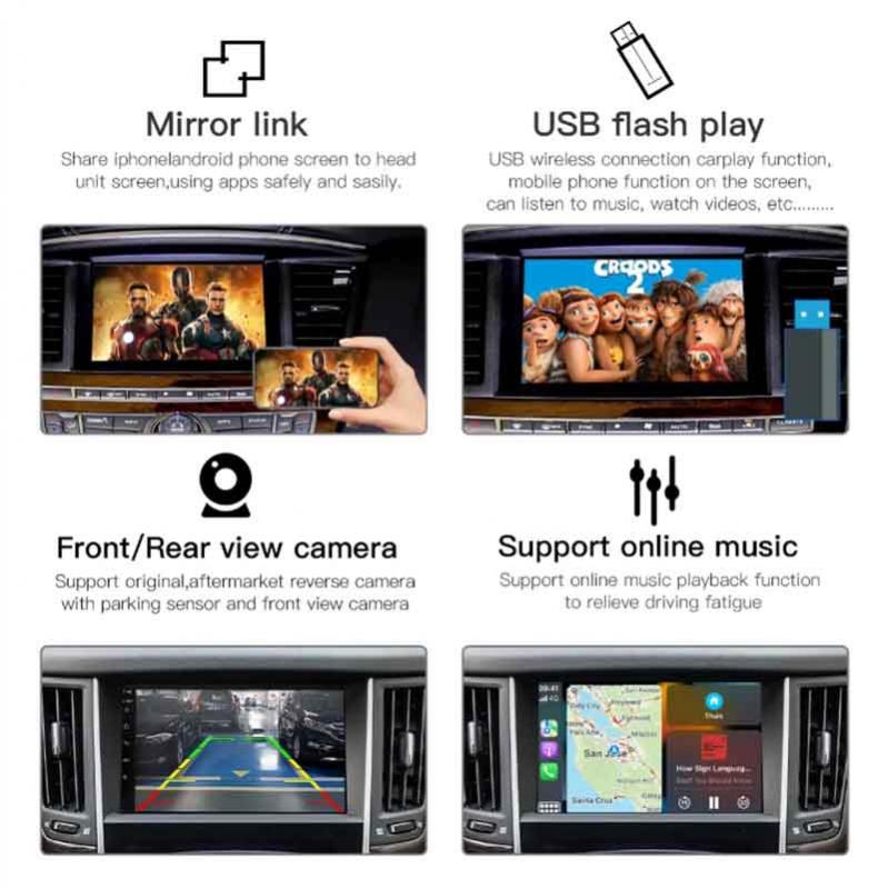 Este Carplay inalámbrico es 100% compatible con Infiniti, compatible con cámara de marcha atrás original de fábrica y radar de estacionamiento.